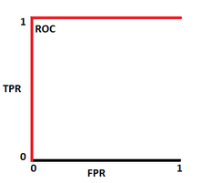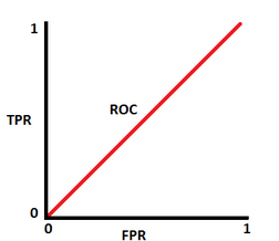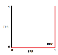 Cuando la tasa de falsos positivos llega a ser igual a1 el modelo en realidad está invirtiendo las clases. Significaría que el modelo predice una clase negativa como una clase positiva y viceversa, en cuyo caso la curva ROC se mira como en la figura 7(c). Dado que TPR y FPR tiene un valor máximo de 1 , el área bajo la curva tendrá un valor de 1.